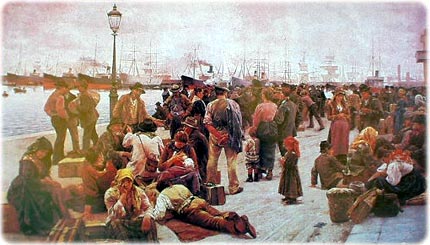 Em cidades como Gênova e Nápoli os portos se aglomeravam com multidões querendo sair do País, pois tinham eles notícia de um lugar chamado América onde tinha condições de trabalhar e fazer a vida, imagem esta vendida pelos agentes das alfândegas (brasileiros inclusive iam para a Itália com este propósito) que lucravam com a exportação de "mão de obra" barata (ou escrava). Analfabetos e inexperientes o povo que queria sair do país chegava dias antes da partida com tudo que podiam carregar. Muitos deles viajaram a pé cruzando o norte da Itália sob um rigoroso inverno para pegar navios que prometiam passagens grátis para o Brasil. Eram fiscalizados rigorosamente pelos agentes que procuravam bens valiosos proibidos que não podiam sair do País, geralmente bens de família em ouro e prata.